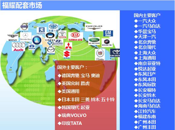 福耀集团是全球规模最大的汽车玻璃专业供应商,产品得到全球顶级汽车制造企业及主要汽车厂商的认证和选用,包括宾利、奔驰、宝马、奥迪、通用、丰田、大众、福特、克莱斯勒等,为其提供全球OEM配套服务和汽车玻璃全套解决方案,并被各大汽车制造企业评为“全球优秀供应商”。