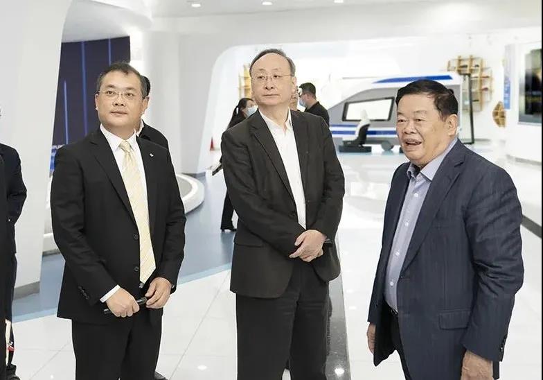 曹德旺(右)、曹晖(左)向尹力书记(中)一行介绍福耀创新情况