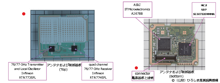 该毫米波雷达是博世制造的76-77GHz雷达,天线及控制主板、以及电源主板这2个主板构成。博世的雷达是具备4个独立的接收通道与数字波束形成(DBF)的双基地多模雷达。凭借这些技术,可利用面向不同方向的独立天线构成毫米波雷达,提高角度测定精度,根据情况可调整雷达的视角。