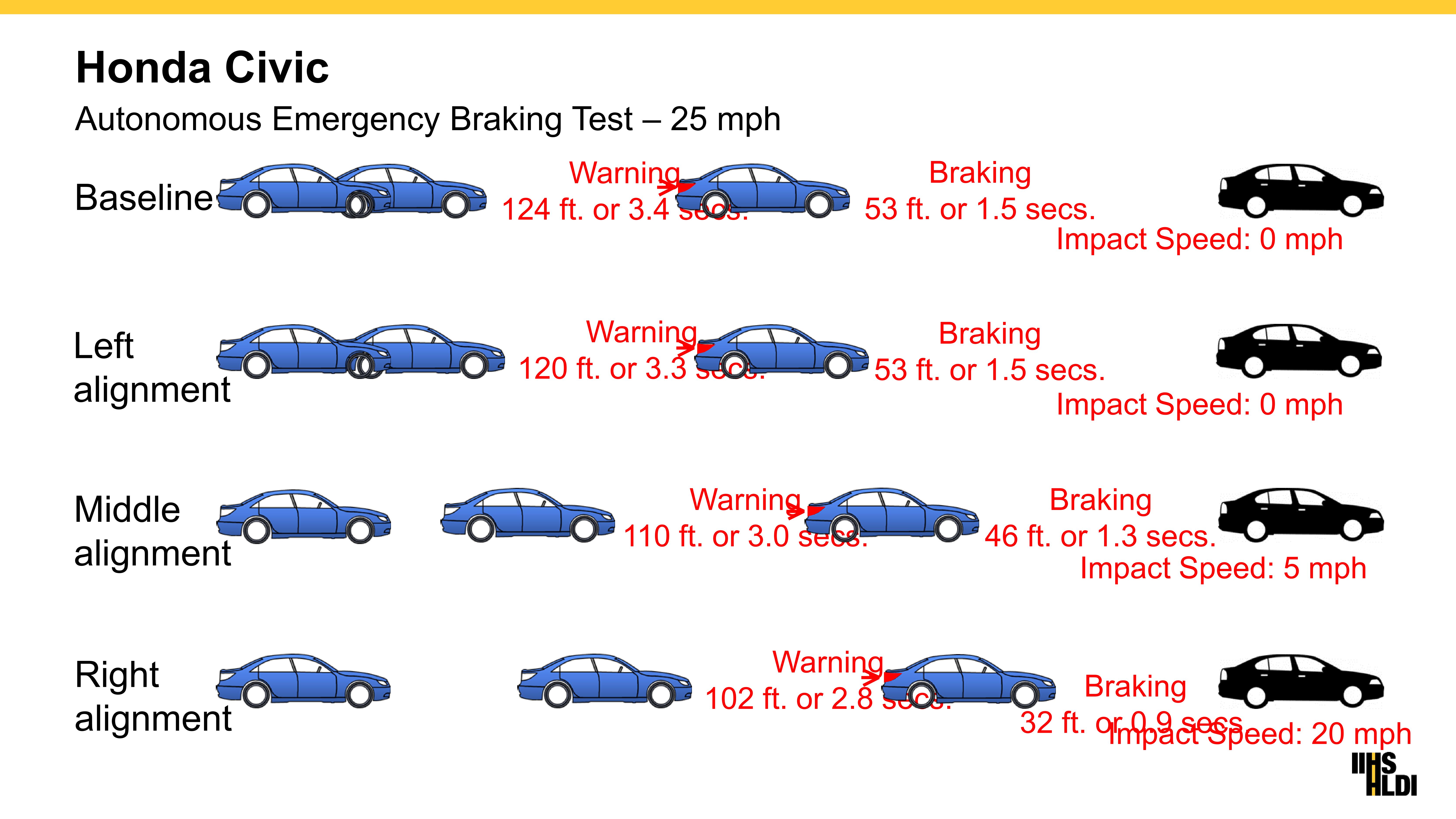 欧麦利说,摄像头的外壳是也不是那麼紧。他甚至可以经过伸手去调整摄像机来操纵汽车,这有点可怕,他警告说这是一条封锁的路途,不要在公路上这样开,比如,不要在家里尝试。他在邮件里写到,“但是,当我把摄像头装在我们另外两个配件玻璃上,它们并没有那麼松。可以安装比较粗略? 这种情况会发作在OEM玻璃上吗?谁知道呢?我猜这就是爲何要求校准的缘由。” IIHS还测试了一辆时速25英里的基准思域(Civic)的自制刹车功用。碰撞警告在撞击前124英尺(3.4秒时)响起,汽车在53英尺(1.5秒)处末尾刹车。摄像头向左转0.4度,招致汽车前部碰撞警告在撞击前120英尺处发出,只留给司机3.3秒反响时间。汽车仍是在1.5秒时,即53英尺处末尾刹车。但是,摄像头向右转0.6度时,碰撞警告直到102英寸外才发出——司机只需2.8秒反响时间。而汽车直到距离碰撞处32英尺处才试图刹车。这0.9秒的刹车时间招致思域(Civic)以时速20英里撞上阻碍物。摄像头看起来正确但支架倾向的情况下,碰撞警告直到110英尺处才发出,司机只需3秒的反响时间。自动刹车直到距离阻碍物46英尺处,即1.3秒时才末尾启动,终汽车以时速5英里撞上阻碍物。