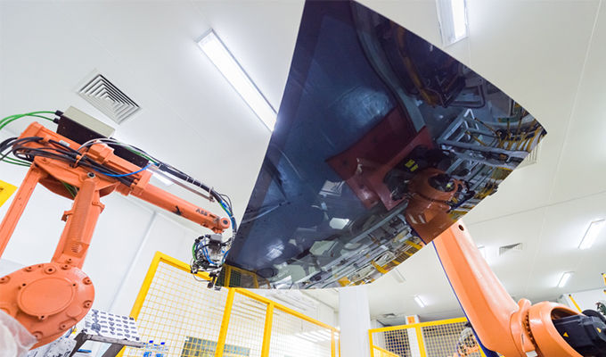 具备高端设备自制能力,通过自制和引进设备双管齐下,对系统优化整合,使整条生产线提升为:由机械手自动上片,采用整线伺服系统控制的切割、掰边、磨边、连线自动印刷后直接与夹层压制炉连线、采用模具压制成型。自制夹层前挡由半自动生产模式提升至连线自动化,可大幅节约岗位数量,减少劳动强度,降低工伤现象,提升产品质量和节能降耗效果。
